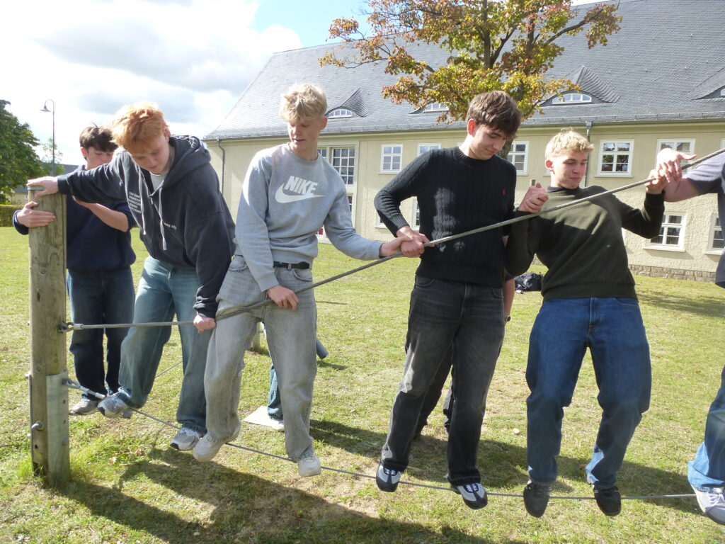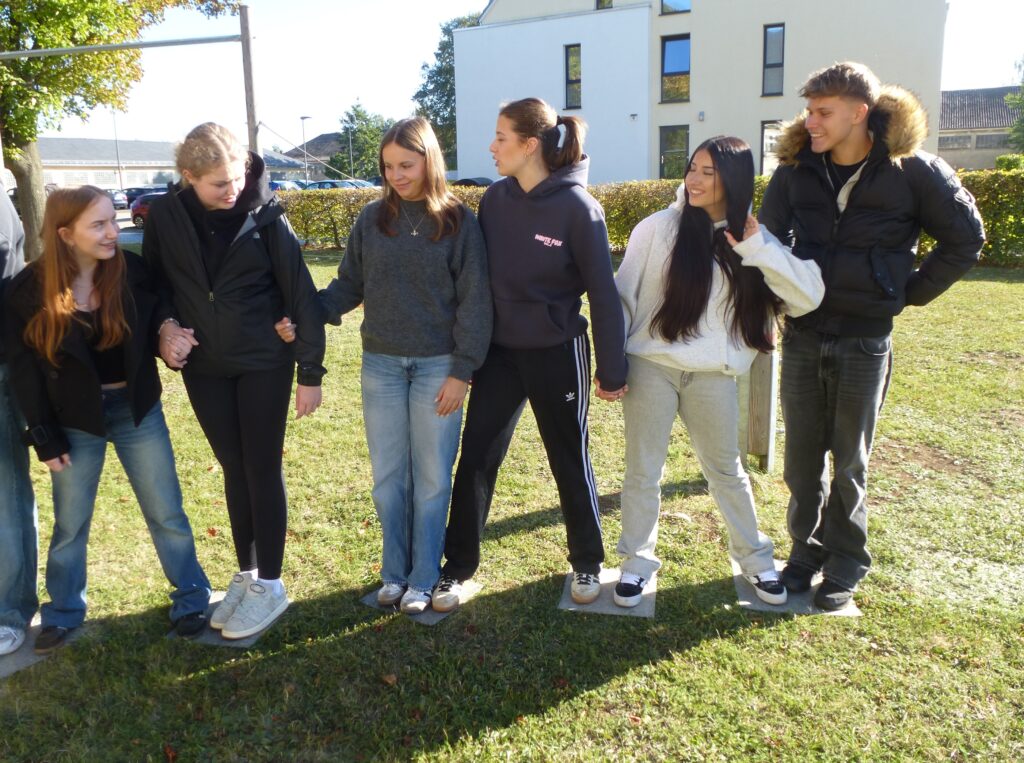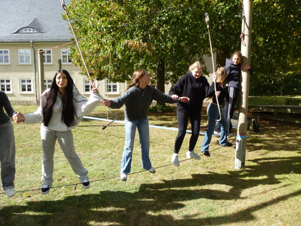 Beim Gleichgewicht auf der Wippe war es ähnlich: jedes Klassenmitglied hatte eine wichtige Rolle, wackelte eine Person, geriet die Balance in Gefahr…. aber mit dem Geschick anderer wurde das Problem schnell behoben. Und zu guter Letzt hieß es Balancieren auf Seilen und Überqueren wackeliger Balken, dabei nie den Kontakt zueinander verlieren – all das wenige Zentimeter über dem Boden, aber mit großer Wirkung. Jeder Schritt erforderte Konzentration, Koordination und vor allem Mut. Besonders beeindruckend war, wie die Gruppe zusammenhielt: Wer zögerte, wurde ermutigt, wer Hilfe brauchte, bekam sie. Und trotz diverser Neustarts, wenn jemand heruntergefallen war, hatten wir eine Menge Spaß.