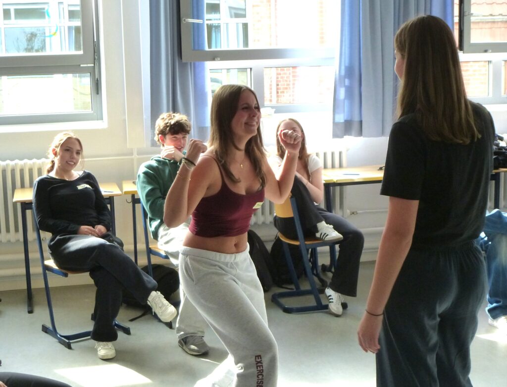 Im Rahmen eines tanzpädagogischen Workshops hatten alle drei Klassen die Gelegenheit, sich einen Tag intensiv mit Bewegung, Ausdruck und Körperwahrnehmung auseinanderzusetzen. Unter der Anleitung zweier erfahrenen Tanzpädagoginnen vom TPZ erarbeiteten die Schülerinnen und Schüler eigene kleine Choreografien und stärkten dabei Teamgeist und Selbstbewusstsein. Der Satz einer Schülerin, „Ich hätte nicht gedacht, dass wir so schnell uns parallel miteinander bewegen können“, bringt es auf den Punkt. Nebenbei wurde auch noch viel gelacht….