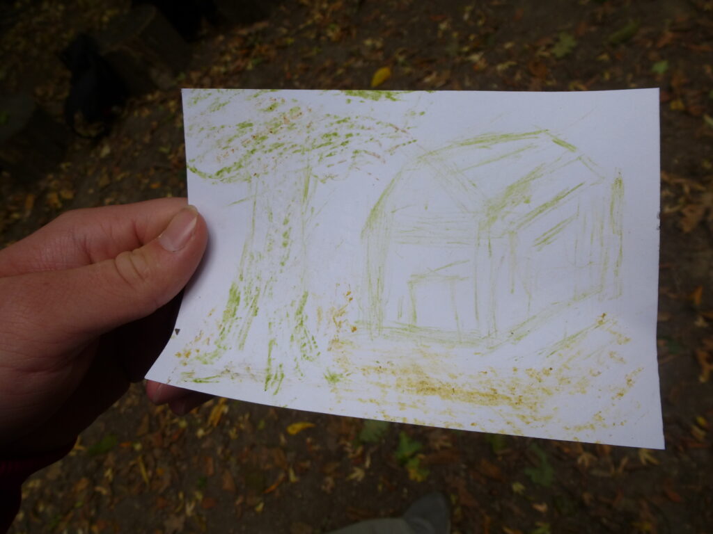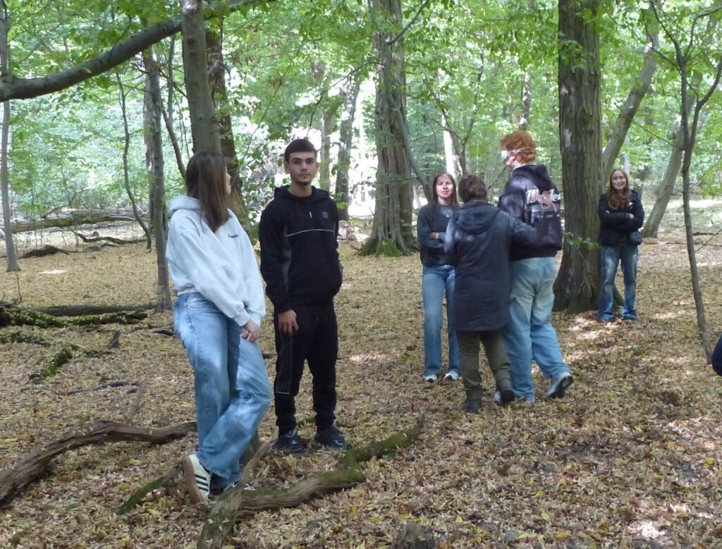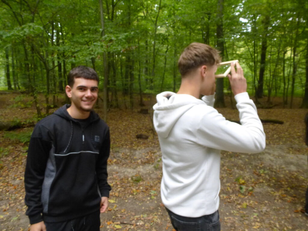 Nach einem Kunst- bzw. Podcast-Workshop und weiteren theaterpädagogischen Aktivitäten war abschließend eine Exkursion in den Wald für alle Klassen dran. Hier wurde die Natur mit allen Sinnen erforscht, per Spiegel, Geruch und Geschmack von Kräutern und Samen oder auch als gemaltes Bild aus gesammelten Blättern.